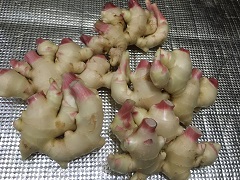 | *生姜は、ショウガ科ショウガ属の多年草 *収穫時期と出荷方法により大きく 矢生姜(筆生姜、はじかみ)⇒葉生姜⇒新生姜⇒ひね生姜(囲い生姜、根生姜)⇒親生姜(古根) の5種類に分けられます 又大きさにより、「大生姜」「中生姜」「小生姜」の3種類の呼び名があります。 更にそれぞれ細かな種類が有ります。 *生姜は、色々な効能があり漢方でも良く使われています。 |