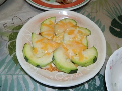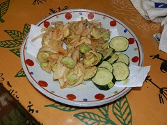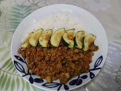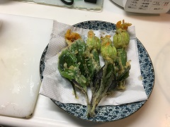| ズッキーニのチーズ焼き | ズッキーニとなすのドライカレー | ズッキーニともやしの桜海老ナムル | 花ズッキーニと金時草の天ぷら |